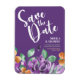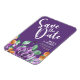 Imán de Salva La Fecha de flores amarillas purpura con marco redondeado hecho con acuarela elegante. Atmósfera de acuarela purpúrea y verde para tu tema de boda creativo y sagrado. Versión púrpura del Imán de Salva La Fecha.