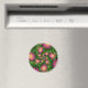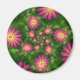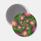 Flores insólitas de fantasía rosa sobre un fondo verde neón. Diseño para su imán redondo y más.