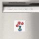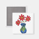 Este es un original cuadro de medios mixtos de flores rojas brillantes en un jarrón azul.