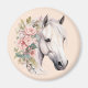 Este imán de bonito muestra el ilustracion de un caballo blanco con flores rosas, sobre un fondo rosa claro. El estilo caprichoso, los colores pastel y el efecto acuarela dan al caballo un aspecto mágico de cuento de hadas. Un encantador regalo equino, un favor de fiesta o un chapuzón para los jinetes.