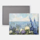Una suave pintura floral costera en pastos claros, con flores moradas, azules y blancas con una delicada vegetación y una tranquila vista al mar a lo lejos, perfecta para casas de estilo costero o de cabaña.