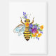 Artistically drawn, flower, honey bee with contrasting colors, yellow, bright, blooming california poppy and blue wild plants on white background.