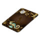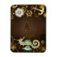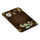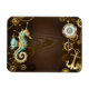 Fondo de madera marrón con mar, cresta mecánica, volante antiguo, ancla dorada y varios engranajes de oro y latón. Estilo Steampunk.