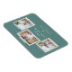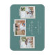 Imán fotográfico de opiniones alegres. Características, 3 fotos enmarcadas con acentos de cinta washi estilo scrapbook, dos líneas de texto de plantilla para tu mensaje, nombres y año con detalles de corazón en blanco sobre fondo de color azul marino.