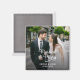 Conmemore la primera Navidad de la pareja como matrimonio con este imán cuadrado de foto de la primera Navidad de recién casados casados y alegres. Este adorno presenta una foto de boda con una superposición de los nombres de la pareja y la fecha de la boda en blanco y las palabras "Casados y alegres" en una hermosa tipografía de escritura.
