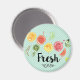 Un imán con un diseño bonito con cítricos que se tambalean - limones, limas y pomelo. La tipografía de moda dice "Fresh" con un lindo y burlón subrayado. El fondo es un patrón verde con puntos de polka blancos.