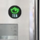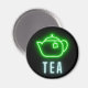 Diseño de imán de cocina divertida con tetera verde neón con texto de neón "Tea" sobre fondo negro