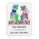 Los huéspedes podrán deleitarse con esta divertida boda con temática de dinosaurios, salvo el imán de invitación a la cita con la colorida novia y novio T-Rex parados en un colorido prado de flores silvestres prehistórico. Fácil de personalizar con los nombres de novias y novios y la fecha del boda. Ilustraciones divertidos T-Rex de novios y novios con un guión moderno y caprichoso de tipografía. Obra original de la artista Catherine Sweetman