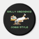 Cosas y regalos divertidos del Rally de Corgi de Pembroke, con un gran corgi personalizado en el centro. El perro está al lado de un cono naranja con el cartel que dice: "Abajo". Bueno, él está abajo... en su espalda, sonriendo como una cabra. El texto dice: "Manifestación Obediencia - estilo Corgi". Gran rally-o-humor para los amantes de las mascotas en este deporte de perros.