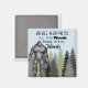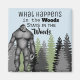 Un imán divertido para tu casa, camper o cabaña. Un bosque con un Sasquatch y el mensaje: "Lo que pasa en el bosque... permanece en el bosque"