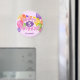 Este lindo imán de cumpleaños incluye el mensaje "Feliz cumpleaños" escrito en galletas esmeriladas rosadas con un arreglo caprichoso rodeadas de globos multicolor y banderas de agrupamiento - la edad y el nombre del niño se pueden personalizar - fondo es un patrón de pequeños puntos de polka blancos sobre un fondo rosa claro - de katz_d_zynes