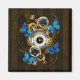 Composición de reloj de vapor redondo con dial numérico romano negro, decorado con arcos de oro y latón, mariposas morfo azules y lentes dañadas sobre fondo rayado marrón. Estilo Steampunk.