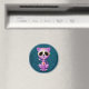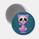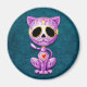 El gatito morado es adorable y está decorado con motivos de remolinos y puntos. Los pedales de flores amarillas rodean los ojos negros puros en la tradición del Día de los Cacahuetes de azúcar Muertos. El gato está sentado, mirando hacia adelante con la cola ondeando en el fondo. La cabeza sobredimensionada se sienta sobre un pequeño cuerpo que crea una apariencia juguetona y personalizado. Una estrella de cinco puntos se sienta en medio de la frente del gatito, mientras que un corazón rojo brillante y amarillo aparece en el centro del pecho. Una sombra cae sobre el fondo azul profundo que hace que el diseño parezca flotar justo por encima de la superficie de este imán. Este lindo gato es un diseño divertido y elegante inspirado en los hermosos patrones de los cráneos del azúcar del Día de los Muertos.