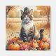 Un cuadro acuarela de un gato alegre sentado en medio de un montón de hojas caídas vibrantes, rodeado de pequeñas calabazas y bellotas dispersas. El Gato lleva un pequeño gorra peregrino y vigas de alegría, capturando el espíritu del Día de Acción de Gracias. Como telón de fondo, los campos de suave cosecha y los árboles de tonos dorados crean un ambiente campestre tranquilo. Las texturas suaves y los tonos cálidos y mudos del otoño le dan al lugar un ambiente acogedor y nostálgico, perfecto para celebrar la belleza de la temporada.