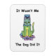 imán de 3 pulgadas x 4 pulgadas con un ilustracion que muestra un gato de aspecto gruñón sentado con una taza de plástico pegado en su cabeza como un casco. Es una postura humorística, un poco sarcástica sobre los gatos, torpeza, y esos momentos "por supuesto que esto me pasaría a mí".