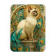 Un majestuoso gato con un exuberante y detallado pelaje se sienta con elegancia entre un adorno de flores y viñas giratorias, todo enmarcado en un intrincado diseño de estilo Art Nouveau. El gato mira hacia arriba con serena sabiduría, bañado por una suave luz dorada, mientras que el fondo florece con ricos tonos pastel y tierra, creando una sensación de belleza intemporal y elegancia natural.