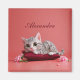 Un lindo gato de tabby, personalizado gris y blanco, se coloca sobre una almohada de color granate con claveles rosas cerca.