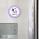 Un imán con el texto: Gracias y diseñado con el ilustracion de un gatito sonriente y ondeando con un manto negro alrededor de su oreja. Fondo del punto de polka morado. Simple lindo y adorable.