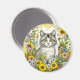 Arte estilo arte folclórico ai que representa a un lindo gato gris y blanco sentado en flores amarillas y blancas.