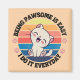 Diseño de estilo retro con texto "Ser guapo es fácil, lo hago todos los días", lindo gato sonriente y decoración de arco iris