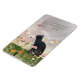 Un gato negro tranquilo se sienta en un parche de flores de bonito y observa a una mariposa colorida volar por el aire. Las palabras "A veces son las pequeñas cosas las que traen alegría a tu día" pueden ser eliminadas o cambiadas si lo deseas.