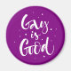 Esta obra de arte incluye texto de guión con la frase "Gay is Good".