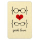 Magnet flexi Premium de gafas Geeky, dulce y extravagante, con un corazón rojo flanqueado por dos pares de gafas geky, una pareja masculina y una pareja ondulada. ¡Este imán dulce le agregará un toque de nerviosismo a cualquier lugar donde lo pegue! Fácil de personalizar, simplemente añada el texto personalizado de su elección. Haga clic en "Personalizar" para encontrar más opciones de personalización.