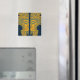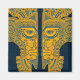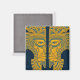 Un par de máscaras de inspiración azteca se enfrentan unas a otras creando la apariencia de una tercera máscara mirando hacia adelante. Las líneas y los círculos intrincados están pintados en un color amarillo dorado que se resalta para producir un brillo sutil en la superficie. El interior y el fondo de la imagen se terminan con tonos azules que caen por el centro del diseño entre las dos máscaras. El apretado recorte de la imagen crea un patrón agresivo que realmente destaca en este imán. Este elegante diseño azteca tiene el aspecto de un antiguo artefacto con un toque moderno.