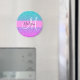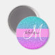 El purpurina de la sirena giratoria y glam morado, lila, aqua y turquesa espuma el nombre del monograma gradiente y el imán inicial. Su nombre personalizado y su monograma están escritos en un guión elegante con letras a mano con un fondo rosado. ¡Un regalo perfecto de cumpleaños o Navidades!