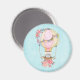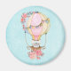 Un imán de diseño adorable con un ilustracion acuático. Un globo de aire caliente decorado con flores rojas y rosas bonitos. Un lindo oso bebé blanco se sienta en la canasta. Fondo azul claro.