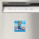 Este imán tiene un recuperador de oro vestido de buceo en el océano. El mensaje dice: "¡Entren justo!".