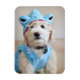 cachorro de goldendoodle con traje de tiburón azul claro.