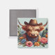 Un ilustracion encantador de una vaca de la Highland sobre un gorra de vaqueros, envuelto en flores y cactus vibrantes y coloridos, que evocan un ambiente alegre y caprichoso.