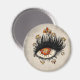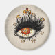 Imán de ojos raros con un ilustracion digital de un ojo hembra con iris roto hecho de lava y pestañas largas terminando en flores bizarras con pétalos angustiados en un cielo gris turbio.
