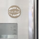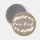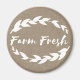 Magnate lindo con marco de laureles blancos y una insignia que lo rodea con la frase "granja fresca" en un fondo de bupía de FAUX. Este imán es un gran toque para tu frigorífico en una cocina de granja.