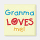 Granma me ama camisetas, pantalones de vestir, tarjetas, bolsas y otros artículos con un diseño de texto azul, rojo y amarillo.