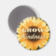 ¡Añade algo de color e inspiración a tu espacio! Este alegre imán de colores muestra una fotografía de un girasol con el sol brillando detrás y la cita "crecer amabilidad".