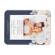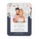 Celebra tu amor con este imán de boda para guardar la fecha, que presenta una elegante plantilla de foto acentuada por flores rosadas y follaje verde botánico. El fondo azul oscuro añade un contraste llamativo, mientras que la tipografía minimalista y el diseño simple ofrecen un encanto atemporal. Perfecto como tarjeta de compromiso magnética, esta pieza destaca hermosamente tu clásica fotografía de compromiso, creando un suave recuerdo romántico que tus invitados apreciarán.