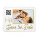 Save The Date Black Gold Stylish Script Modern Boda Magnets cuenta con un fondo negro con tu foto personalizado. Personalice el texto editando el texto en los cuadros de texto proporcionados y agregue la dirección URL de su sitio web para el código QR de su personalizado. Diseñado por ©Evco Studio www.zazzle.com/store/evcostudio