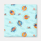 Cuidada temática de color azul hielo de un fiesta de piscina con un diseño de ilustracion divertido de juguetes de piscina y gente divertida en una gran piscina de agua aguamarina. Perfecto para unas vacaciones de verano.
