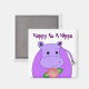 Un hipopótamo púrpura fresco con flores y un lindo dicho acento este imán. Feliz como hipopótamo con elegante letra morada.