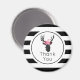 Un imán con una cabeza de ciervo negra de líneas geométricas y una corona floral rosa. Diseño rústico y de moda. El fondo es un patrón con rayas negras y blancas.