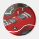 una fotografía de una guitarra eléctrica de seis cuerdas roja semi hueca con unión blanca sobre una ocho negra en un concierto. Añade tu propio texto personalizado para un diseño musical personalizado, o usa esta gran fotografía de guitarra como es!