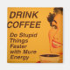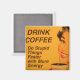 Mujer sonriente con lápiz labial rojo retro y uñas bebe su taza de café matutino. La leyenda dice "Beba café - Haz las cosas estúpidas más rápido con más energía".