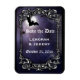 Murciélago negro volando contra una luna llena blanca con un diseño plateado ornamentado que rodea la imagen. Las telarañas y las telarañas están colgando del diseño. Ahorre el imán de fecha para su boda especial de Halloween u otro evento especial.