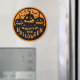 Audaz y festivo, este imán negro y naranja de Halloween presenta linternas sonrientes de jack-o’, murciélagos y un mensaje de "Halloween feliz" con espeluznantes letras.