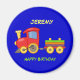 Happy Birthday, Toy Train Birthday Button. This is a template, substitute your own child's name. from BIRTHDAY GIFT STORE at www.zazzle.com/birthdaygiftstore for unusual and creative gifts.