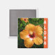 El imán Hawaii cuenta con una flor tropical de bonito - un hibisco de color naranja y coral bajo el cálido sol de la mañana hawaiana con el tradicional saludo de aloha.