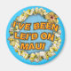 Flor Lei sobre fondo de agua azul con un texto ondulado "HE SIDO LEI'D ON MAUI"