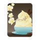 un ilustracion de un delicioso postre helado con decoración de salpicaduras de chocolate en un bol azul con detalles de orquídea de vainilla en un fondo marrón © y ® Bigstock® - Todos los derechos reservados.